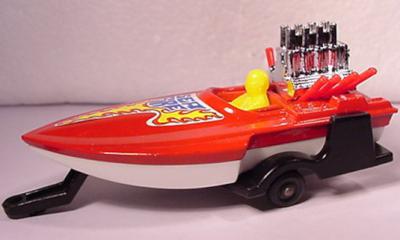 white hull, red deck, filled engine block, red exhausts, SEAFIRE, black plastic trailer |