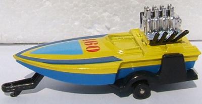 blue hull, yellow deck, silver engine block, black exhausts, light and dark blue with red 460, black plastic, no origin trailer |