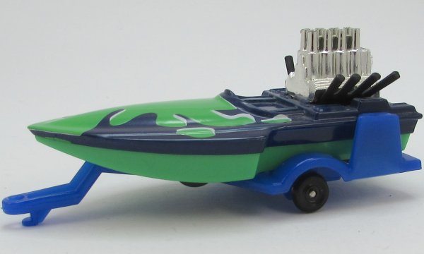 green hull, navy blue deck, silver engine block, black exhausts, green splash, blue plastic C trailer |