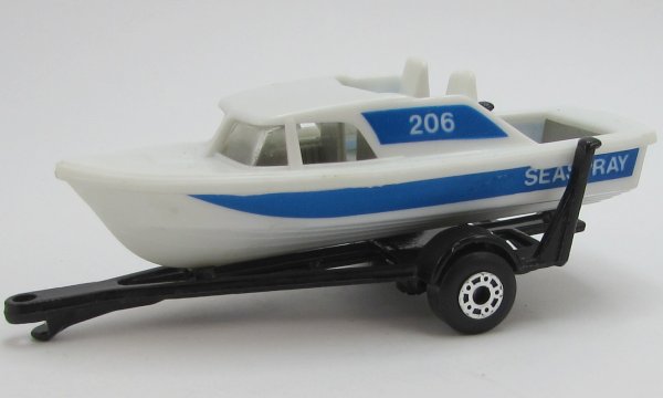 milky white deck, white hull, SEASPRAY dark blue deco, black trailer |