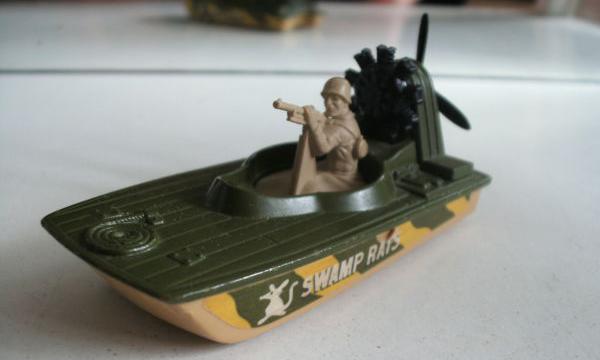 olive green deck, black engine, olive green engine cover, light tan hull, black pointed propeller, SWAMP RATS labels |