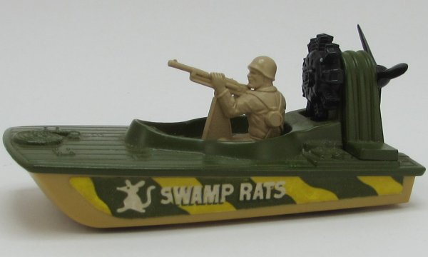 olive green deck, black engine, olive green engine cover, dark tan hull, black pointed propeller, SWAMP RATS labels |