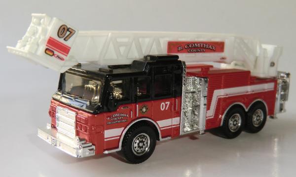 red, black cab roof, white ladder, B COMTHAX COUNTY tampo |