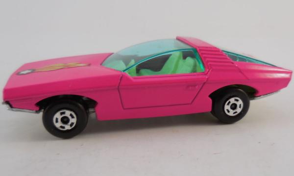 pink, small holes, pointed trunk edge rear casting, star and flame label with black circle (irregular top) deco |