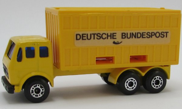 yellow, yellow roof and doors, yellow container, container type base without lettering is part of body, ribs top and bottom, smooth center, opening doors, DEUTSCHE BUNDESPOST (round) labels |