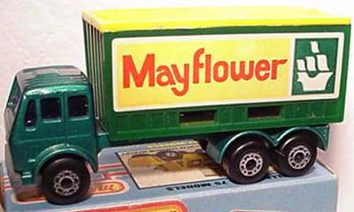 metallic green, yellow roof and doors, green container, container type base without lettering is part of body, ribs on bottom only, upper smooth section, opening doors, MAYFLOWER (sided) labels |