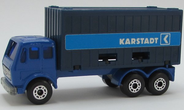 dark blue, very dark blue roof and doors, very dark blue container, container type black separate base with "P.S.1 CONTAINER" lettering, doors do not open, KARSTADT (sided) labels |