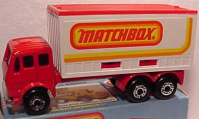 red, red roof and doors, white container, container type base without lettering is part of body, ribs on bottom only, upper smooth section, opening doors, MATCHBOX (sided) labels |