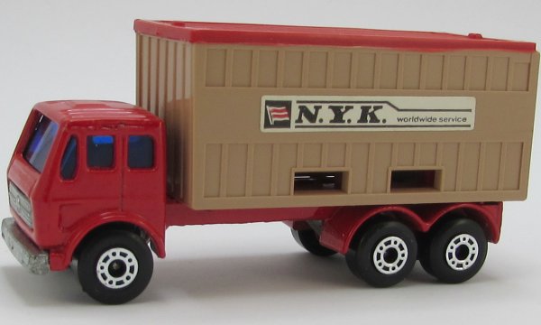 red, red roof and doors, tan container, container type base without lettering is part of body, ribs top and bottom, smooth center, opening doors, N.Y.K. (from MI725) labels |
