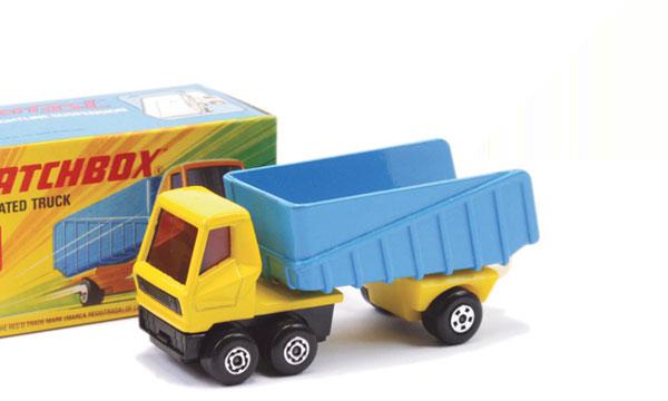 lemon cab, black cab base, lemon trailer base, trailer rear casting type no license, with hole, wide braces, no ridge, blue dump, no labels |
