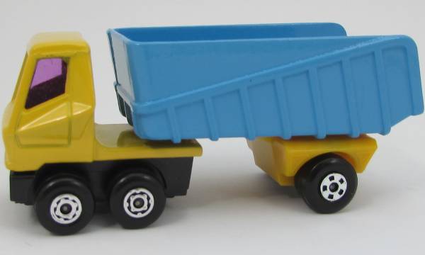 orange-yellow cab, black cab base, orange-yellow trailer base, trailer rear casting type with license, no hole, no ridge, blue dump, no labels |