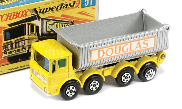 lemon cab chassis, asymmetric inside gaps chassis sides, silver-gray dump, DOUGLAS labels |