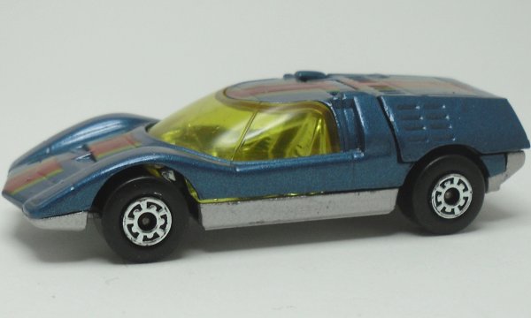 | metallic blue, chrome engine, wide red, narrow dull yellow stripes |