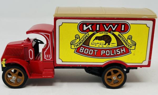 red, red cab roof, black chassis, red fenders, red container, tan roof, KIWI BOOT POLISH labels tampo |