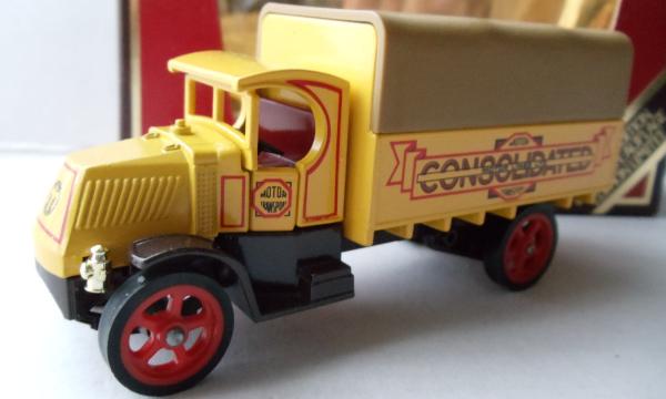 yellow, yellow cab roof, black chassis, dark brown fenders, yellow bed, tan canopy load, CONSOLIDATED TRANSPORT tampo |