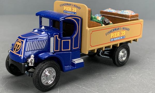 dark blue, dark blue cab roof, black chassis, dark blue fenders, pea green bed, porcelain load, FISHERMAN'S WHARF PIER 39 tampo |