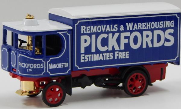dark blue cab, red chassis, white roof, dark blue container, white roof load, REMOVALS & WAREHOUSING-PICKFORDS tampo |
