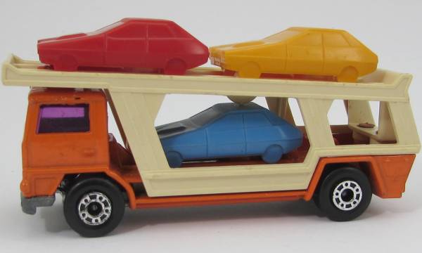 Body light orange, beige carrier, red / orange-yellow / light blue cars (front, rear, bottom)