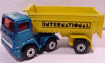 metallic blue cab, yellow dump, with LEYLAND cast, with cast panel, INTERNATIONAL tampo |