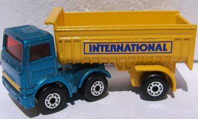 metallic blue cab, yellow dump, with LEYLAND cast, with cast panel, INTERNATIONAL tampo |