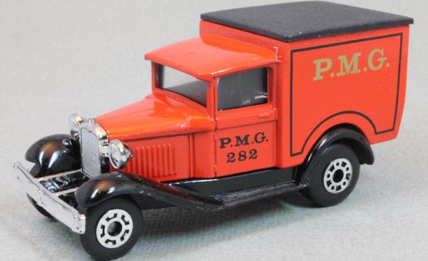dark orange, black chassis, black textured roof, KG license plate, P.M.G. deco |
