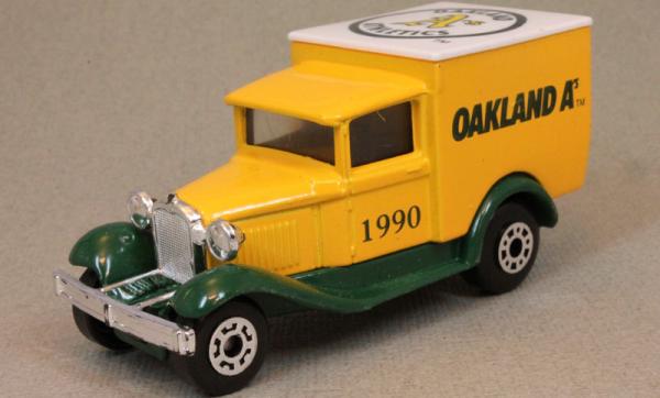 Body yellow, green chassis, white smooth roof, KG license plate, OAKLAND A's deco