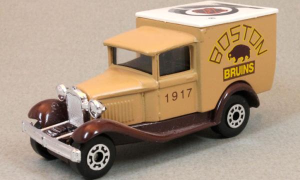 Body tan, brown chassis, white smooth roof, KG license plate, BOSTON BRUINS 1917 deco