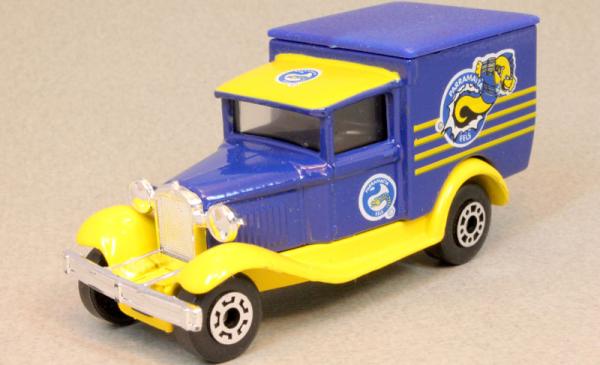 Body blue, yellow chassis, blue textured roof, KG license plate, PARAMATTA EELS, yellow cab roof deco