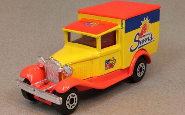 yellow, salmon chassis, red textured roof, KG license plate, TOWNSVILLE SUNS, red cab roof deco |
