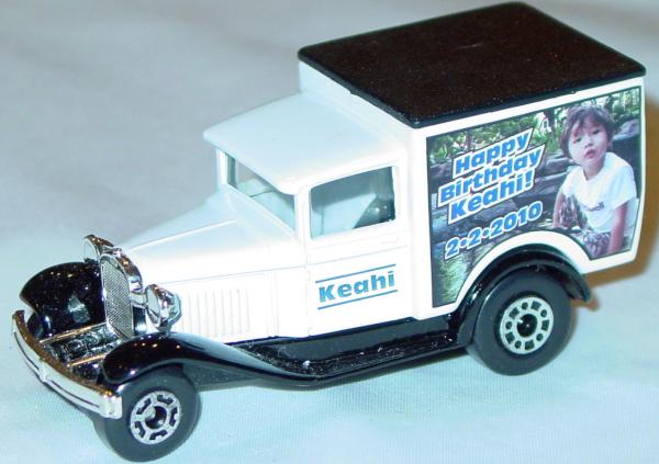 white, black chassis, black textured roof, DR license plate, HAPPY BIRTHDAY KEAHI! deco |