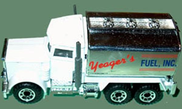 Body white, gray exhausts, chrome grille, front only fender braces, no cab tampo, silver tank, YEAGER'S FUEL, INC. (red and blue, left side only) tank tampo