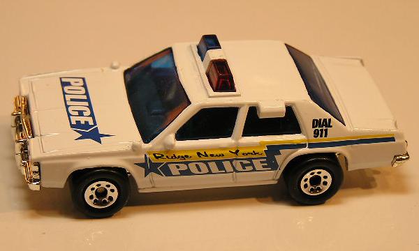 white, red and blue roof light, chrome grille, RIDGE NY POLICE tampo |
