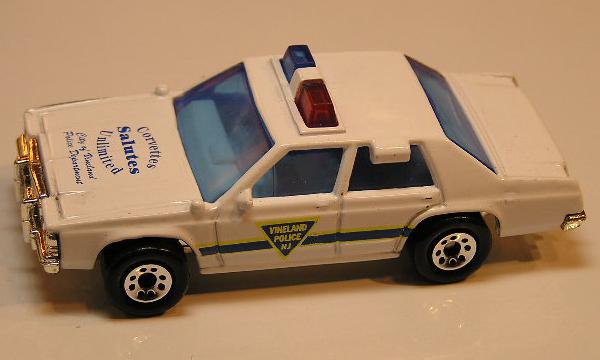 white, red and blue roof light, chrome grille, VINELAND POLICE tampo |