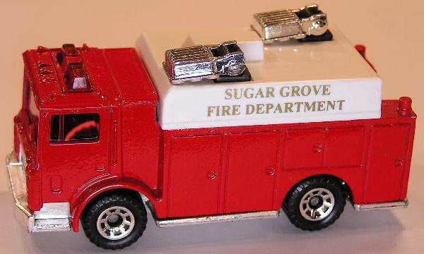 Body red, white roof, silver and black roof fixtures, SUGAR GROVE FIRE DEPT. (gold, left roof side only) tampo