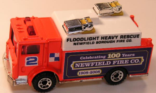 fluorescent orange, white roof, silver and yellow roof fixtures, 100 YEARS NEWFIELD FIRE CO. tampo |
