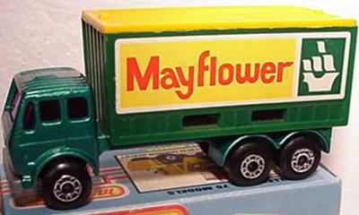 metallic green, orange roof and doors, green container, container type base without lettering is part of body, ribs on bottom only, upper smooth section, opening doors, MAYFLOWER (sided) labels |