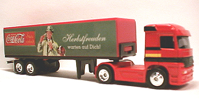 | Trailer Detail | red container with black chassis, COCA COLA HERBSTFREUDEN WARTEN AUF DICH! labels |