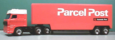 | Trailer Detail | orange-red container with black base, PARCEL POST labels |