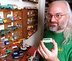 Dierschow, a soft-spoken man who says he washes his clothes "quarterly," still has his first toy car: a 1962 Volkswagen Caravette, a camper in mint green. His parents gave it to him when he was 7 years old. He has an MGTD Sports Car, a 1929 4.5-liter Bentley and an ERF 686 Ever Ready Platform truck -- more than a thousand toy vehicles in all. While showing off his cars, Dierschow turns into a nerd version of Vanna White, holding them up proudly and chatting about his best piece: a 1953 Elizabeth II coronation coach. Dierschow calls the beat-up coach his Holy Grail. When he decided to become a collector of Matchbox toys in his late 20's, Dierschow found the coach.